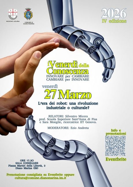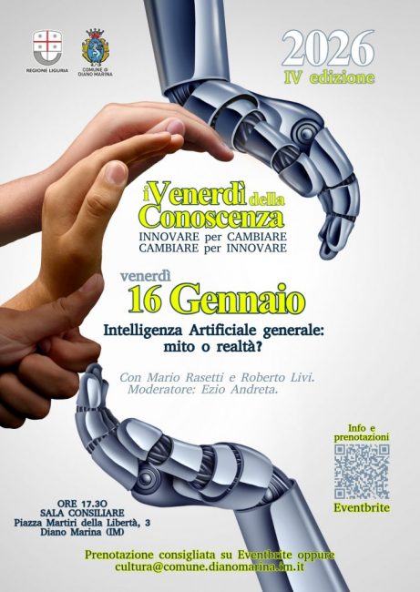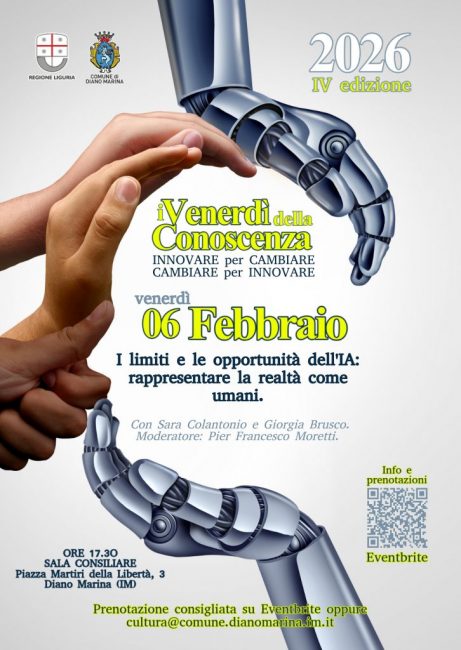 Il Comune di Diano Marina organizza la 4^ edizione dei Venerdì della Conoscenza, l’iniziativa culturale che punta a promuovere il dialogo sui grandi cambiamenti che stanno plasmando il nostro tempo. L’evento, patrocinato dalla Regione Liguria, prenderà il via venerdì 16 gennaio 2026 alle ore 17:30 nella Sala Consiliare.