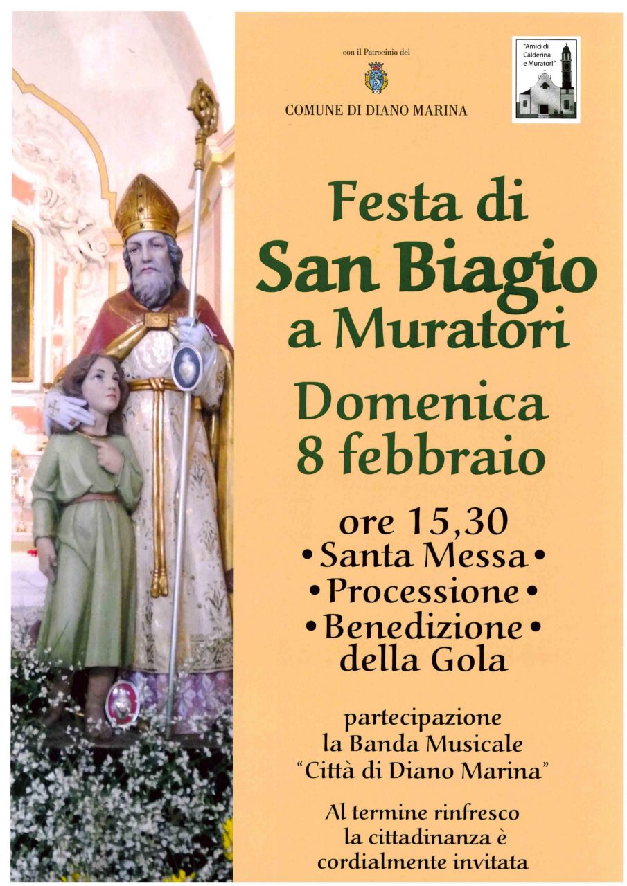 Nella frazione di Diano Calderina, in Borgata Muratori, festa patronale di San Biagio con tradizionale Benedizione della Gola nella Chiesa nell'Oratorio San Biagio. Parteciperà la Banda Musicale "Città di Diano Marina".
