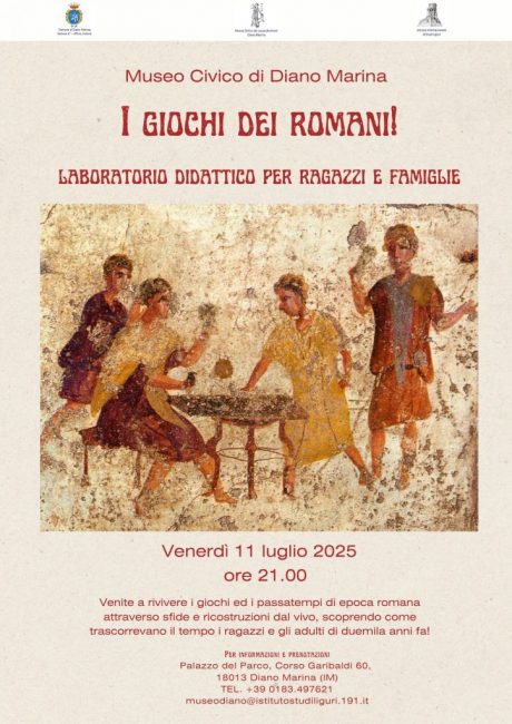 Nel calendario delle iniziative estive, il Museo ha programmato per venerdì 11 luglio alle ore 21.00 il laboratorio didattico per ragazzi e famiglie “I giochi dei Romani”, uno speciale appuntamento serale dedicato ai più piccoli alla scoperta dei giochi dell’infanzia e da tavolo utilizzati nell’antica Roma! I visitatori avranno modo di toccare con mano fedeli ricostruzioni di tavole da gioco, pedine, dadi e astragali, scoprendo le regole e cimentandosi in sfide a punti lungo le sale della Sezione Archeologica.