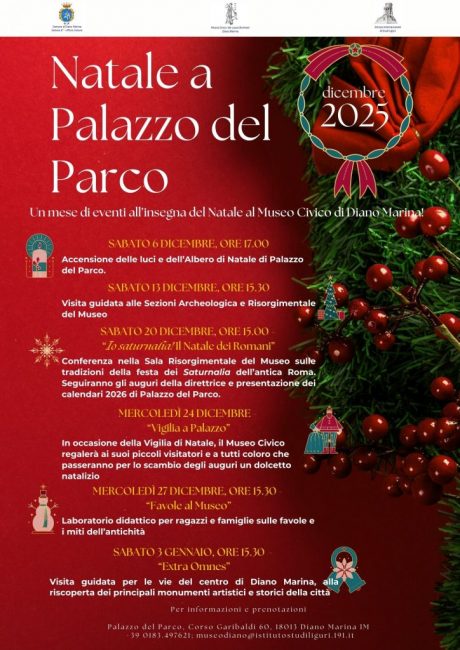 Nel giorno di sabato 20 dicembre alle ore 15.00, il museo ospiterà la conferenza “Io saturnalia! Il natale dei Romani”, un incontro nella Sala Risorgimentale del Museo a cura di Federico Lambiti (Museo Civico del Lucus Bormani) e di Luca Storino (Museo Civico archeologico “Girolamo Rossi” di Ventimiglia) sulle tradizioni della festa dei Saturnalia dell’antica Roma. Seguiranno gli auguri dell’assessore alla Cultura Sabrina Messico e della direttrice di Palazzo del Parco Daniela Gandolfi. In quest’occasione verranno anche presentati i calendari 2026 della Biblioteca e del Museo Civico di Diano Marina.